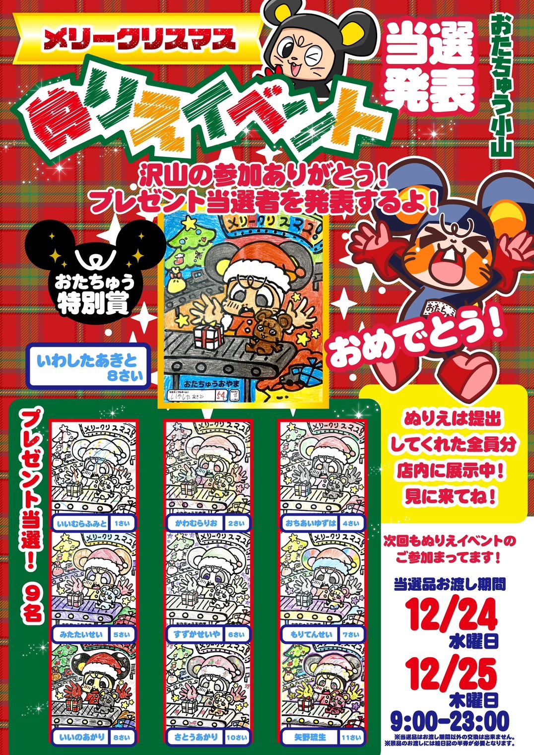 みんなが書いてくれたクリスマスぬりえは店内に展示してありますので、ご来店の際はご覧になってみてください🥰