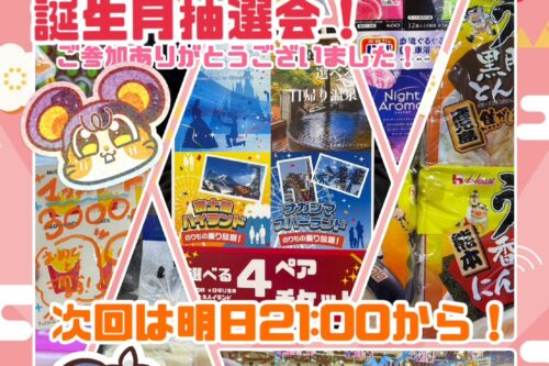 🎂お誕生月抽選会開催御礼🎍 イベント 2026年1月10日 🎂お誕生月抽選会開催御礼🎍 誕生月抽選会、無事終了しました🎉 ご参加くださった皆様ありがとうございました‼️ 2026年最初の誕生月抽選会‼️ 本日はお正月🎍🌅🎍らしくお餅から始まりまして、のど飴や、マシュマロ、入浴剤に…ねばーる君⁉️ 目玉はなんと近江牛🐮🍖 当選されたお客さま おめでとうございます‼️🎊 次回は明日の21:00から開催です‼️お待ちしております🐭 これからも、楽しいイベントを用意して参りますので、ぜひSNSのチェック等よろしくお願いします‼️