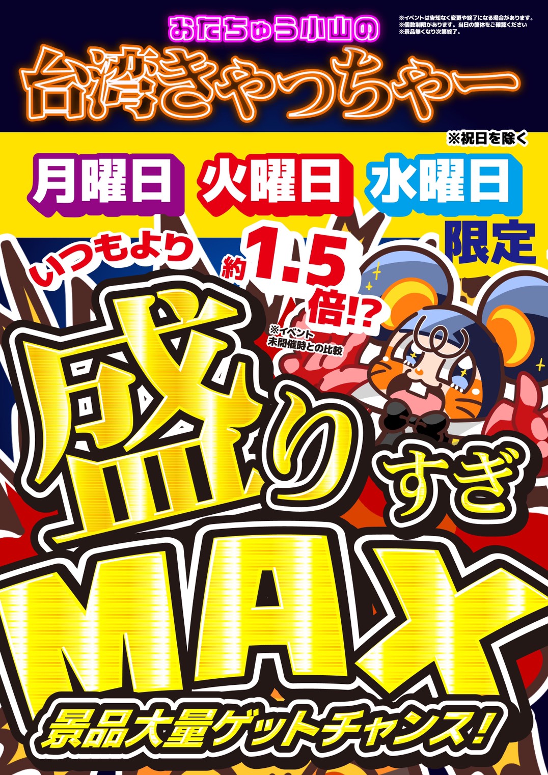 ★《月曜日、火曜日、水曜日 限定!》台湾キャッチャーが盛りすぎMAX(乂’ω’)!?★ イベント アミューズ 2026年1月21日 おたちゅう小山の台湾キャッチャーが!盛りすぎMAX(乂’ω’)!? 月曜日、火曜日、水曜日 限定! おたちゅう小山の台湾キャッチャーが景品山盛り! いつもより景品が1.5倍!? 盛られすぎ注意! 掴んで、投げて、大量GET!? 月、火、水はおたちゅう小山の台湾キャッチャーに集合! ************************ こちら↓もぜひチェックしてみてくださいね♪(*´▽`*) ・最新のイベント情報はこちら ・最新の買取情報はこちら