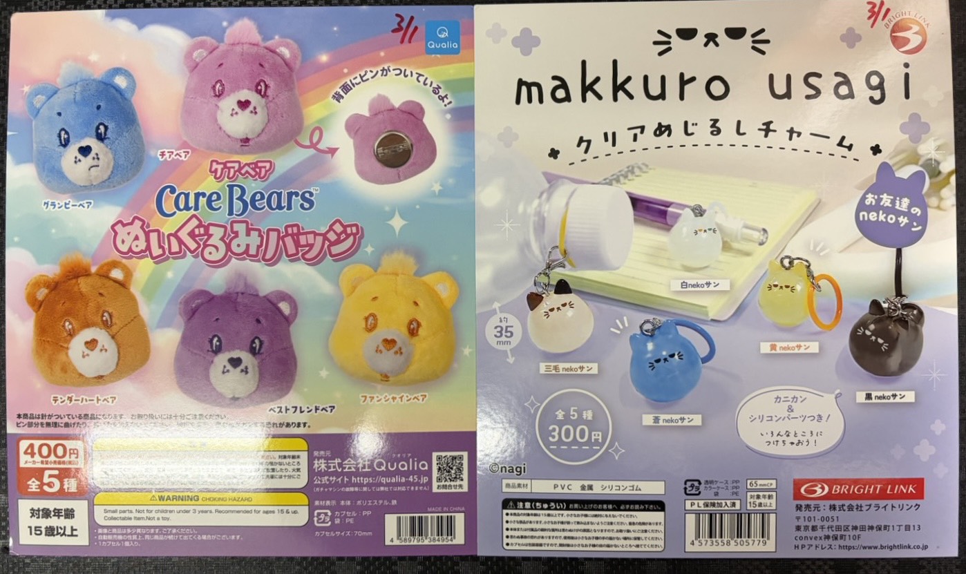 ガチャ担当よりお知らせです- ̗̀ 📢💭《ケアベア ぬいぐるみバッジ》など ガチャ 2026年3月1日 ガチャ担当よりお知らせです- ̗̀ 📢💭 下記入荷致しました! ケアベア ぬいぐるみバッジ makkuro usagi クリアめじるしチャーム ぜひたくさん回しに来てください✨皆様のご来店お待ちしております🐭🌟
