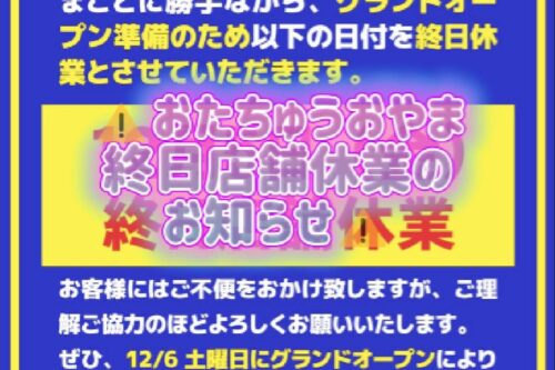 ⚠️終日店舗休業のお知らせ⚠️まことに勝手ながら、グランドオープン準備のため12月5日(金) 終日店舗休業とさせていただきます。 お知らせ 2025年11月27日 ⚠️終日店舗休業のお知らせ⚠️ まことに勝手ながら、グランドオープン準備のため以下の日付を終日休業とさせていただきます。 12月5日(金) 終日店舗休業 お客様にはご不便をおかけ致しますが、ご理解ご協力のほどよろしくお願いいたします。 ぜひ、12/6土曜日にグランドオープンにより生まれ変わったおたちゅう小山をお楽しみください! スタッフ一同お待ちしております。 おたちゅう小山